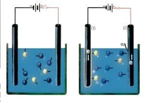 يتم توصيل الكاثود والأنود في الخلية الإلكتروليتية بمصدر طاقة، تم العثور على هذين القطبين المستقرين ومحلول إلكتروليت سائل في كل خلية إلكتروليتية، يوصل محلول الإلكتروليت الكهرباء لأن الأيونات الذائبة يمكن أن تتحرك بحرية في المحلول.