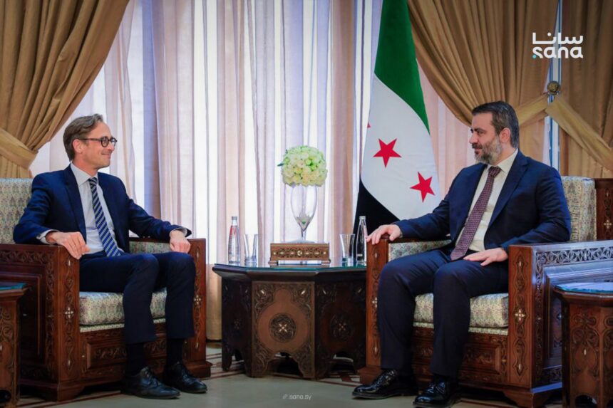 استقبل وزير الخارجية والمغتربين أسعد حسن الشيباني اليوم، توبياس تونكل، مدير شؤون الشرق الأوسط والشرق الأدنى وشمال أفريقيا في وزارة الخارجية الألمانية.