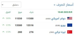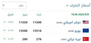 وبحسب النشرة الصادرة عن مصرف سورية المركزي، بتاريخ 08-09-2025، بلغ سعر صرف الدولار الواحد 11000 ليرة سوريّة، وذلك للمصارف العاملة، وشركات ومكاتب الصرافة وسعر صرف الحوالات الخارجية والأفراد.