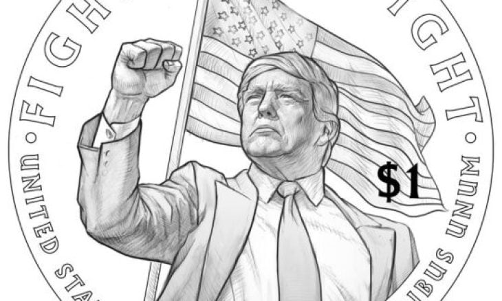 ويُظهر أحد التصاميم صورة لترامب على الوجه الأول للعملة النقدية بينما يحمل الوجه الثاني صورة أخرى له رافعاً قبضته أمام علم أميركي مع عبارة “حارب حارب حارب” وهذه الصورة أخذت بعد محاولة اغتياله العام الماضي خلال حملته الانتخابية.