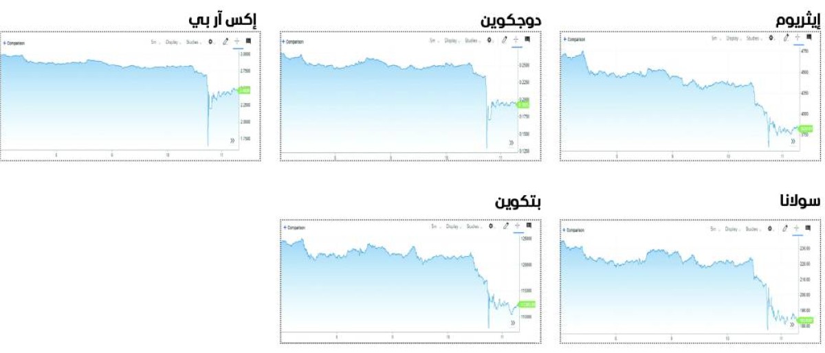 وهبط سعر بتكوين من مستويات قرب الـ 123 ألف دولار الأسبوع الماضي إلى 112969 دولاراً مسجلاً انخفاضاً نسبته 8 % كما انخفضت عملة الإيثريوم بنسبة 14 % لتتراجع من 4526 دولاراً إلى 3879 دولاراً بنهاية يوم الجمعة فيما فقدت سولانا نحو 9.7 % من قيمتها لتستقر عند 205 دولارات بعد أن كانت 227 دولاراً في الأسبوع السابق كما سجلت عملتا دوغكوين وإكس آر بي خسائر أسبوعية حادة.