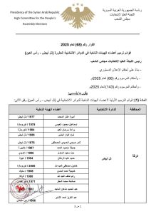 كما مددت اللجنة في قرارها فترة تقديم الطعون على القرار رقم (60) الصادر بتاريخ 28 -9- 2025 (المتضمن القوائم الأولية لأعضاء الهيئات الناخبة لدائرتي تل أبيض ورأس العين) لمدة ثلاثة أيام اعتباراً من تاريخ الـ 12 من تشرين الأول.