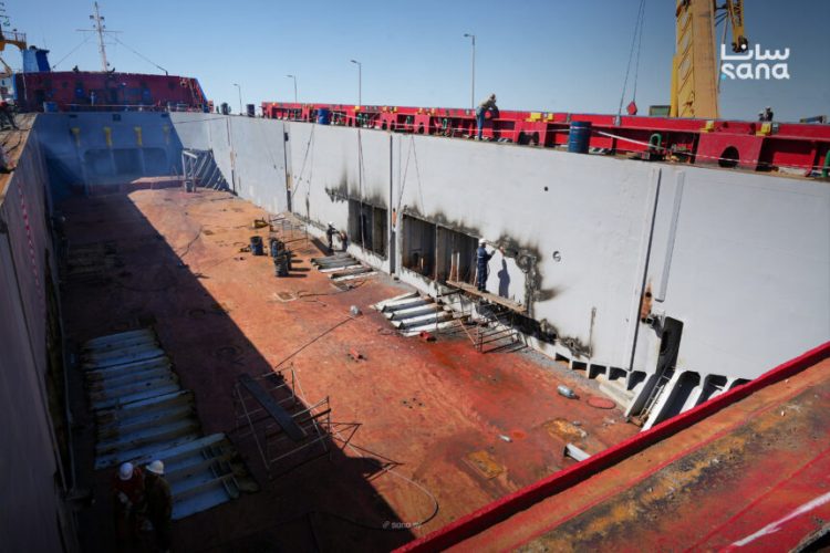 تواصل ورشات الصيانة في ميناء بانياس بمحافظة طرطوس، والتي تضم نخبة من الكوادر الوطنية والخبرات الفنية، تنفيذ أعمال تحويل الباخرة التجارية “TUWIQ 3” إلى باخرة مخصصة لنقل المواشي، في خطوة تعكس تطور القدرات المحلية في مجال الصيانة البحرية وتحديث البنية التحتية للموانئ السورية.