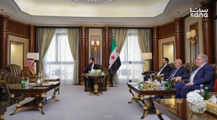 عقد الرئيس أحمد الشرع جلسةً مع رئيس مجلس الأعمال السعودي – السوري محمد أبو نيان بحضور وزير الخارجية والمغتربين أسعد حسن الشيباني ووزير الاقتصاد والصناعة نضال الشعار ووزير المالية محمد يسر برنية.