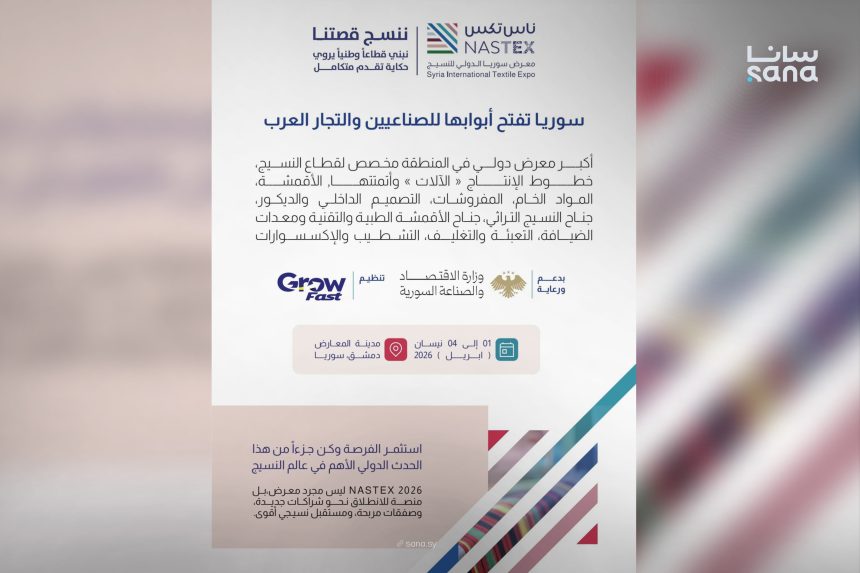 أعلنت وزارة الاقتصاد والصناعة عن إقامة معرض سوريا الدولي للنسيج “ناس تكس” على أرض مدينة المعارض بدمشق بمشاركة عدد كبير من الشركات المحلية والخارجية، وذلك في إطار الجهود الحكومية الرامية إلى دعم الصناعة الوطنية، وتطوير قطاع النسيج، باعتباره أحد أهم القطاعات الإنتاجية في البلاد.