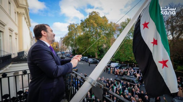 رفع وزير الخارجية والمغتربين أسعد حسن الشيباني العلم السوري فوق السفارة السورية في لندن.