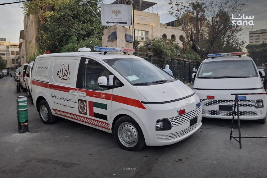 تسلمت وزارة الصحة اليوم 16 سيارة إسعاف مقدمة من هيئة الأعمال الخيرية العالمية في الإمارات لدعم منظومات الإسعاف، وذلك في مبنى الوزارة بدمشق.