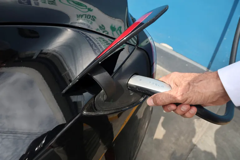 انتشار السيارات الكهربائية يقلل البصمة الكربونية لقطاع النقل ويخفض انبعاثات الكربون في الغلاف الجوي (رويترز)