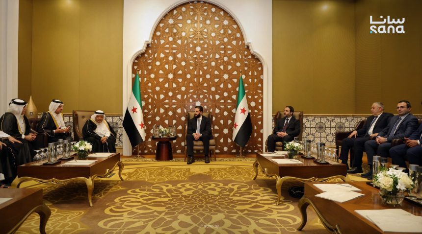عقد الرئيس أحمد الشرع جلسة في العاصمة القطرية الدوحة مع رابطة رجال الأعمال القطريين برئاسة الشيخ فيصل بن قاسم آل ثاني رئيس الرابطة وعدد من الأعضاء وذلك على هامش أعمال منتدى الدوحة 2025 وبحضور وزير الخارجية والمغتربين أسعد حسن الشيباني.