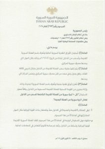 المادة (6): الوحدة الصغرى من الليرة السورية هي القرش، وفق المعيار التالي: “كل مائة قرش تعادل ليرة سورية واحدة من العملة السورية الجديدة”.