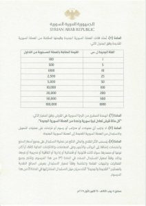 المادة (5): تُحدد فئات العملة السورية الجديدة وقيمتها المقابلة من العملة السورية القديمة وفق الجدول الآتي: