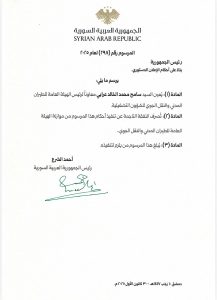 وكان الرئيس الشرع أصدر المرسوم رقم (213) لعام 2025 القاضي بإحداث الهيئة العامة للطيران المدني والنقل الجوي لتحل محل المؤسسة العامة للطيران المدني.