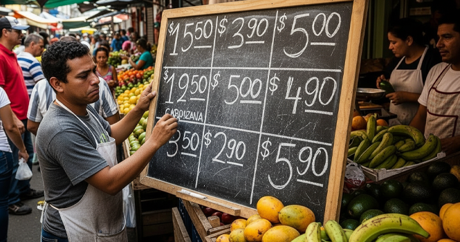 في صباح اليوم، تتوجه إلى المتجر في كاراكاس لتشتري الاحتياجات الأساسية لأطفالك، وتتساءل عن الأسعار لتجد أنها تتغير كل حين – على غرار الأسهم في البورصة – ولكن ليس من خلال شاشة إلكترونية بل عبر سبورة أو لوح تقليدي يقوم البائع بتعديله بصورة مستمرة، حتى أن ثمن طبق البيض (30 بيضة) أصبح 6.40 دولار، في حين يحصل العامل البسيط على أجر لا يتجاوز 60 سنتًا شهريًا.