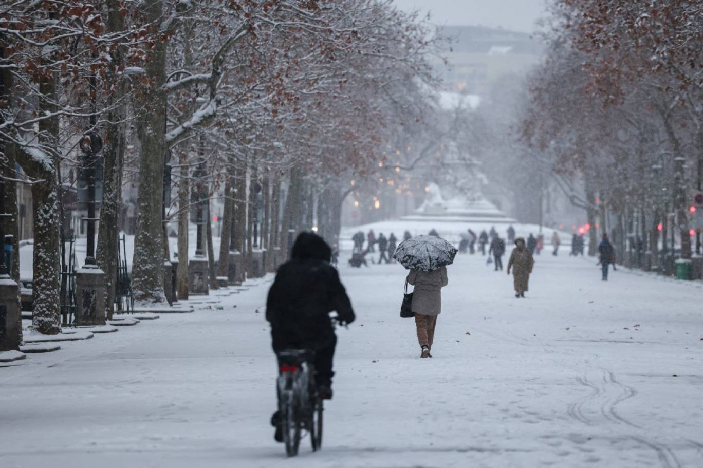 أحد المشاة يحمل مظلة يسير بجانب راكب دراجة في شارع مغطى بالثلوج في باريس (أ ف ب)