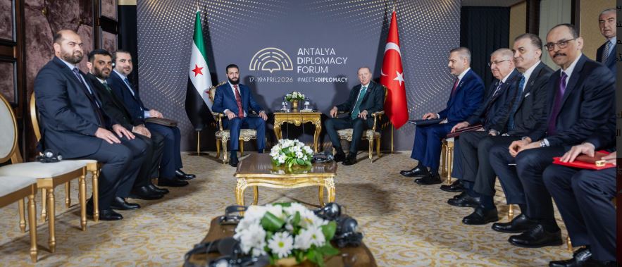 التقى الرئيس أحمد الشرع رئيس الجمهورية التركية رجب طيب أردوغان والوفد المرافق له، بحضور وزير الخارجية والمغتربين أسعد حسن الشيباني ورئيس جهاز الاستخبارات العامة حسين السلامة، على هامش أعمال منتدى أنطاليا الدبلوماسي.