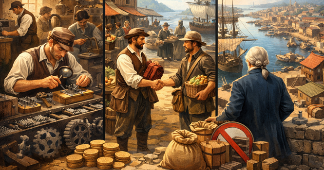 يُعد كتاب «بحث في طبيعة وأسباب ثروة الأمم» لآدم سميث كتاباً طويلًا، لكن في أول عشرين صفحة منه، يضع سميث مسارًا من ثلاث خطوات نحو الازدهار، يعرض الفصل الأول مفهوم تقسيم العمل، ويشرح الفصل الثاني ميل البشر إلى المقايضة والتبادل، بينما يوضح الفصل الثالث كيف أن التخصص محدود بمدى اتساع السوق.